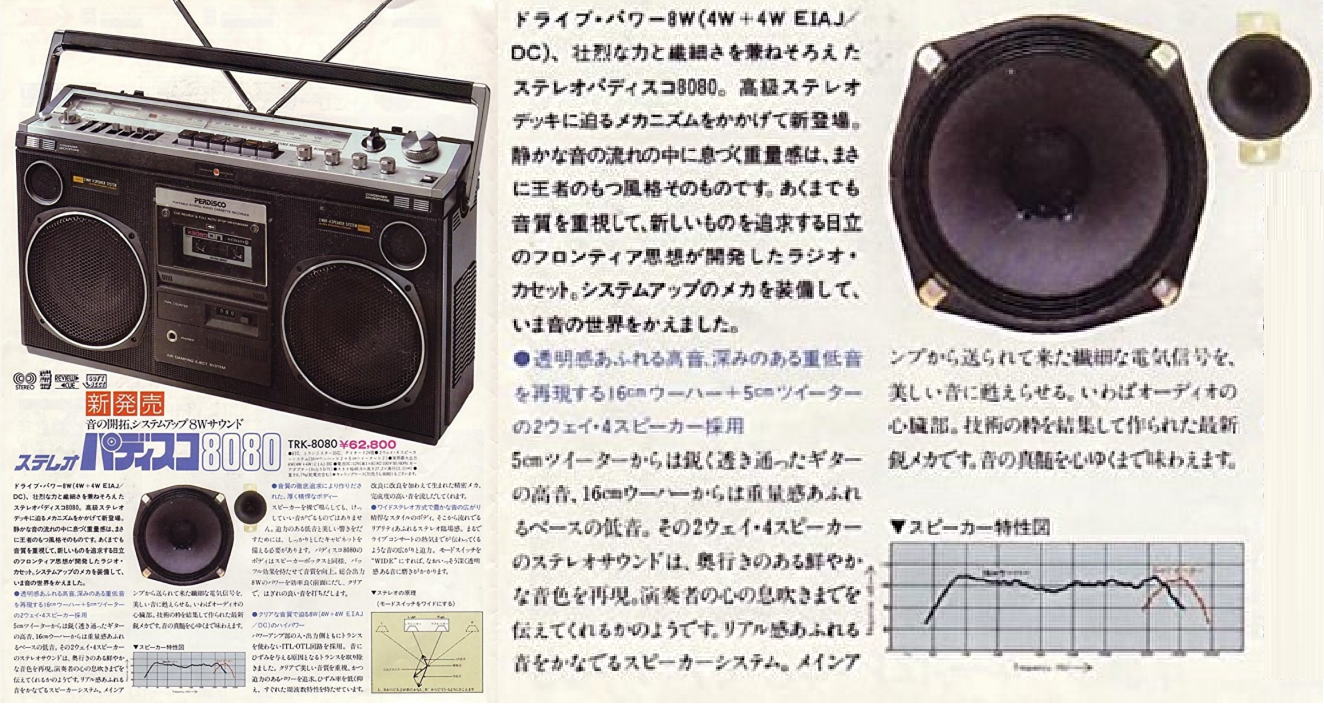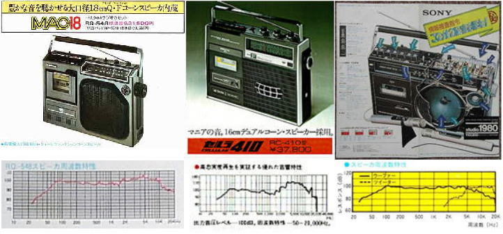 上のラジカセの周波数特性を見て分かると思うが、ラジカセに搭載されていたフルレンジ、ウーハーともども、エクステンデッドレンジというAMラジオ専用のスピーカーだった。これは戦前から続く音声規格で、ボーカルをマイクで拡声するために、ハウリングに強く、交流電源のハムも拾いにくいなど、必要十分な周波数レンジとして登場したのだが、事柄はラジオだって同じである。