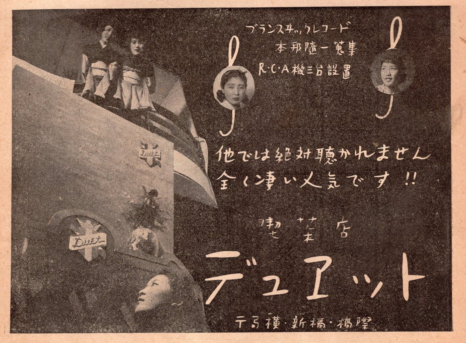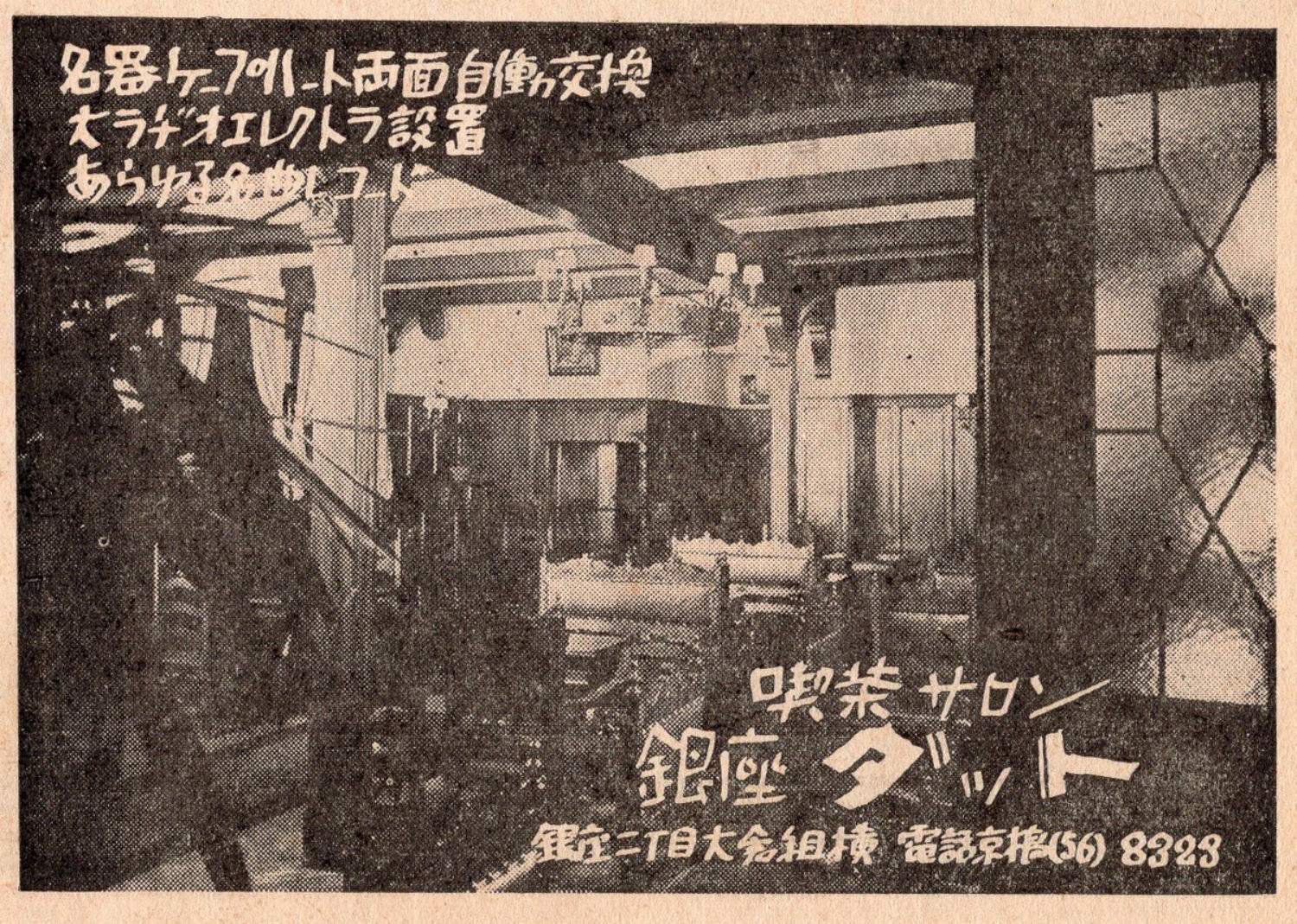 とはいえ、銀座や新橋の一流どころの喫茶店となると、ケープハート製の高級ラジオ電蓄を置いたり、米ブランズウィックのジャズレコードや米RCA製の電蓄(日本ビクターではない)を複数台置くなど、舶来品の贅を尽くした音楽喫茶も存在した。ちなみに喫茶ダットは音楽喫茶のはしりで、立原道造や永井荷風などの小説家たちが静かに時間を過ごすのに懇意にしていた店である。ケープハートの電蓄は、最初にオートチェンジャーを備えた電蓄で、最高級の400シリーズともなればWEのトーキー機器でも使われたJensen社のAuditoriumスピーカー(14インチ+18インチ!!)を奢っており、ちょっとしたダンスホールでも十分に通用する音響性能をもっていた。喫茶ダットにあったのは、その中で一番小型の200シリーズと思われるが、それでも8インチスピーカーが高級電蓄の旗印だった時代にJensen製12インチのコンサート用スピーカーを装備しており、性能としては十分抜きんでていた。新橋のデュエットもジャズ喫茶のはしりとして知られる名店で、写っている女給はレコードガールと言われる人たちと思われる。