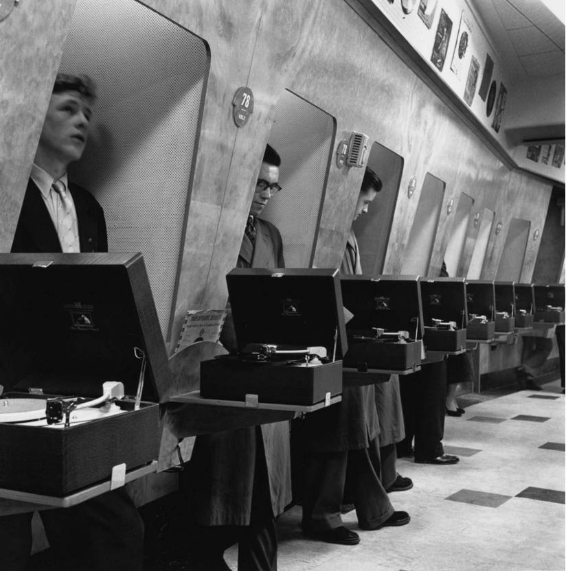 1950年代末に存在したHMVロンドン本店にあるSP盤コーナーと試聴ブース