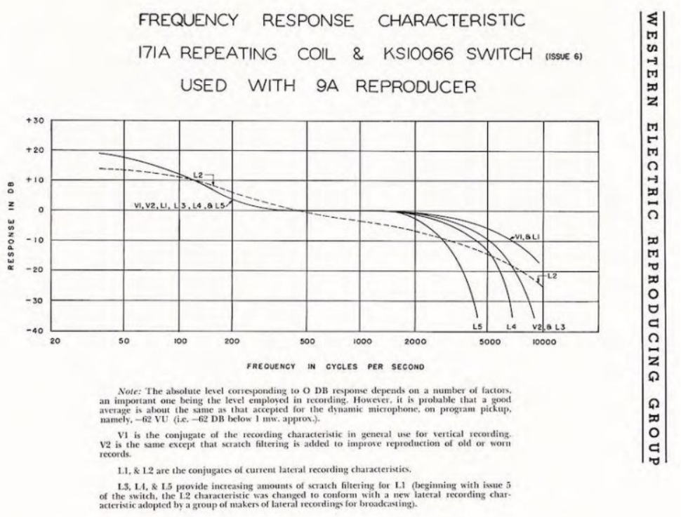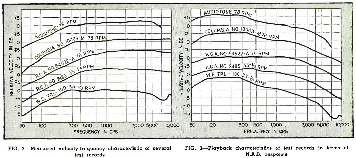 最近の録音の多くは、NAB規格に適合するように調整されたピックアップで再生すると、良好な音色バランスを示します。・・・シェラックタイプの家庭用レコードでは、サーフェイスノイズを考慮すると、再生時の高周波応答はNAB規格にほぼ従って低下します。後述する理由により、4,000~5,000cpsを超える周波数では、NAB規格で規定されているよりも大きな減衰が望ましい場合が多くあります。8,000cpsを超える市販レコードの有用な周波数成分はごくわずかであることは間違いありません。