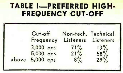 筆者は、家庭用レコードの再生において、リスナーが高域カットオフを好むかどうかを調べるため、数々のテストを行った。テストは、技術者ではないリスナー100人と、ラジオ技術者100人以上を対象に行われた。これらのテストの詳細は本稿の範囲外であるが、表Iに示した結果は、決定的なものではないものの、家庭用レコードの再生において、5kcpsを超える応答では、忠実度の向上に見合ったものではなく、サーフェイスノイズと歪みの影響が強調されることを示している。
