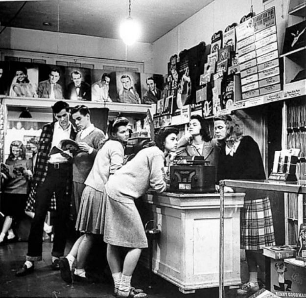 ボーリング場でミルクシェイクを飲みながら歓談する若者(1940年代)