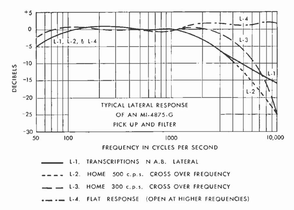 RCA LC-1Aの周波数特性(1947年時点はSP盤用フィルター装備)