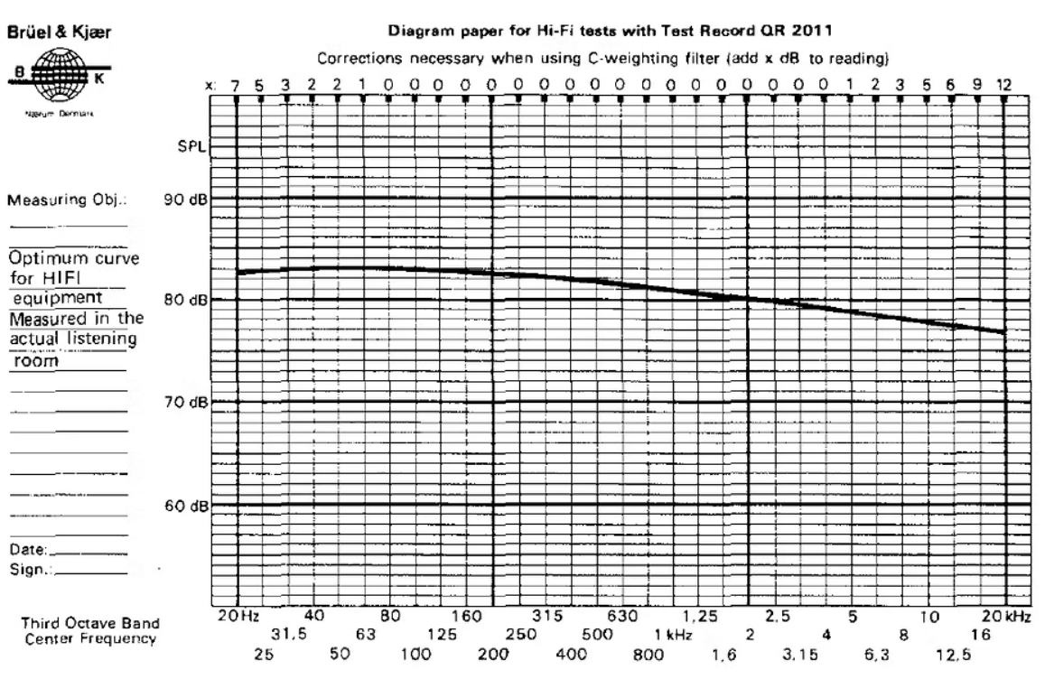 では、実際の録音スタジオの音響はどうだったかというと、1966年時点では3kHzをピークにロールオフしていく特性だった(これはラジオ用スピーカーとも相似)だったのに対し、1974年にB&K社が調査した家庭用のオーディオルームの特性は200Hzから-1dB/octずつなだらかに降下するもので、これ以降に建設される録音スタジオのターゲット特性として広まるようになった。