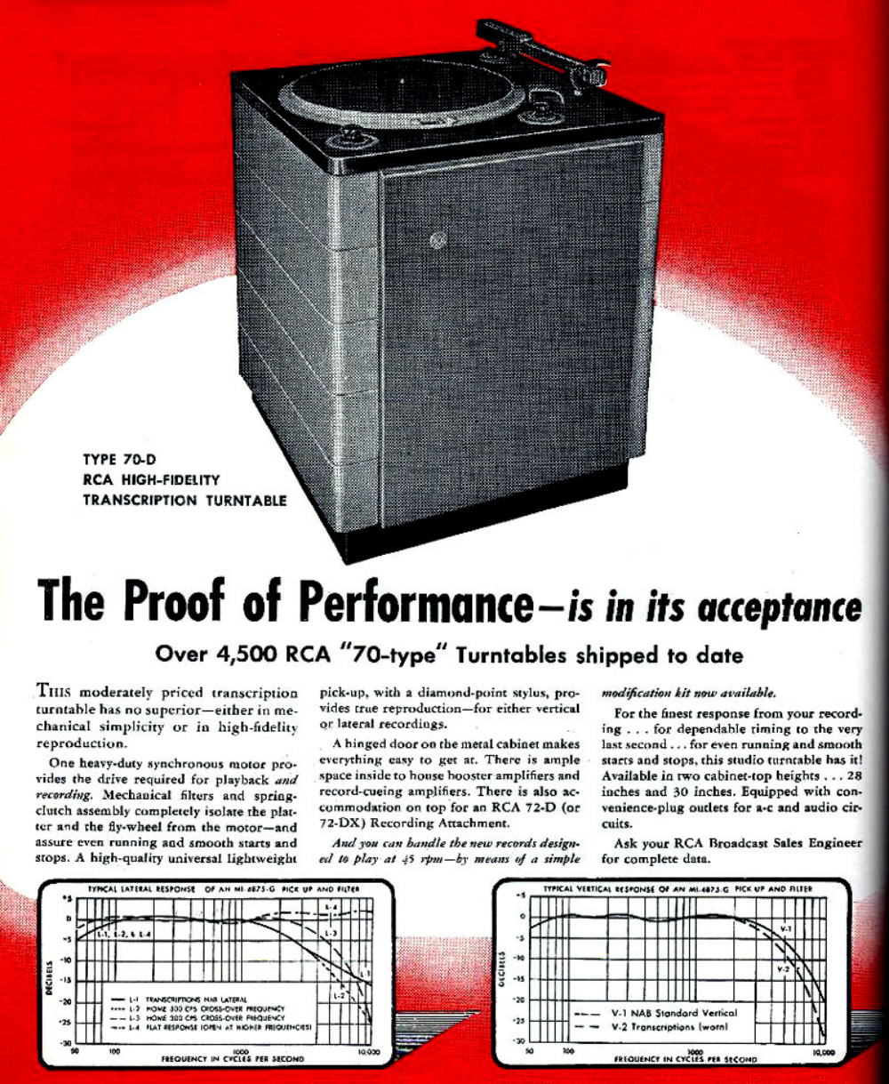 以下は超メジャーレーベルのRCAのモニタースピーカー、局用レコードプレイヤー、南部のスタジオの音響などであるが、いずれもオプションとしての旧規格のトーンキャラクターに収束していることが分かる。これは78rpm盤のサーフェイスノイズを嫌って、少し早めにロールオフさせることを好んでいたことと関連している。シュアー社の技術長も規格上はプリエンファシスなしで入れているのに対し、NABカーブで適度に高域を落として聴くことを勧めている。結果的に、ナッシュビルやテネシーのようにカントリーやフォークを好んだ地域では、1966年に至っても旧規格でのサウンドでミキシングが行われていた。これが自然なアコースティックに基づくのだと知るには、フラット崇拝のモニター方法から耳を離れて、高域を聞き取れるように慣らす必要があるだろう。
